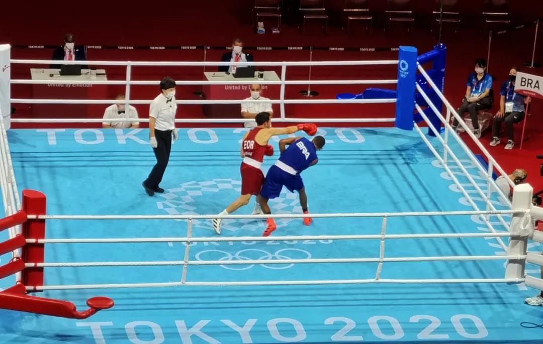 东京奥运会拳击热身馆,体育工作人员帮助运动员穿戴拳击手套