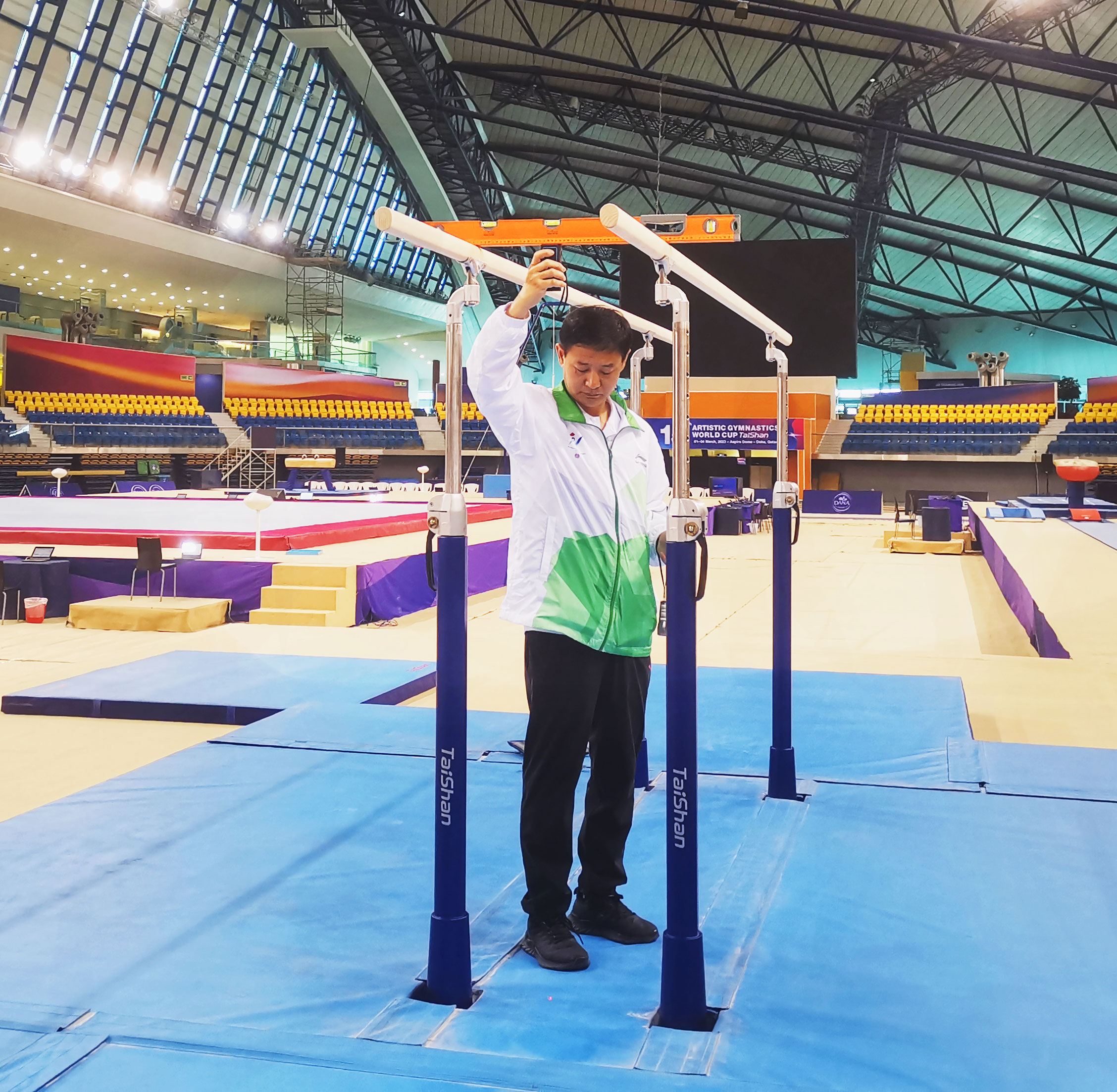 在精彩的赛事背后,离不开体育团队的默默付出。体育专业服务保障团队驻扎赛场全程守护,为大赛保驾护航。赛前,他们连续日夜奋战,如期完成训练场馆、热身场馆、比赛场馆每件器材的安装、调试,检测工作,为比赛做好充分保障;赛中,服务人员30秒内即可完成高低杠的升杠降杠,保证了比赛的流程进行。保障团队以高效、精准、专业的表现震惊全场,赢得了极高赞誉。